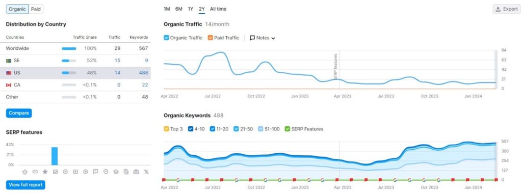Traffic increased from 21 to 915 monthly visits, showing strong growth after the first 6 months as SEO gained traction.